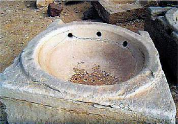 Podél východní stěny nádvoří je sada devíti kruhových křemencových nádrží. Předpokládá se, že původně bylo nádrží deset. Nikdo dnes už neví, kde přesně tyto nádrže stály, protože byly přemístěny. Je zajímavé, že vnitřní povrchy pánví jsou na dotek úžasně hladké a vykazují známky kruhových stop nástroje, což naznačuje, že ten, kdo je vytvořil, učinil tak pomocí technologie, kterou bychom obdivovali i dnes. Někteří učenci věří, že tyto nádrže byly použity pro sběr krve z obětovaných zvířat. Na podporu této hypotézy se poukazuje na skutečnost nalezených kruhových otvorů vedoucích z kamenné kruhové vany ven, které mohly být případně použity na odtok krve. Jiní výzkumníci si myslí, že otvory byly pravděpodobně jen symbolické nebo dekorativní, protože žádné nože nebo jiné nástroje vztahující se k oběti nebyly v této oblasti objeveny. Zatím se neobjevil nikdo, kdo by vysvětlil účel těchto kamenných bloků.